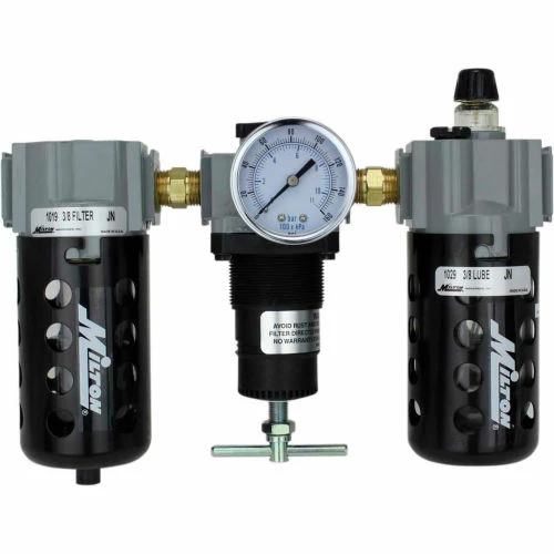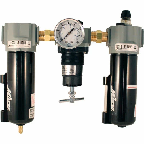 1/2″ NPT Deluxe FRL trio is a filter regulator and lubricator all in one. The filter comes with an automatic overnight drain which will operate whenever liquid accumulates in the filter bowl. The regulator is the relieving type which will exhaust air downstream when pressure rises above the maximum preset pressure. The drip type lubricator allows for precise setting. This pre-assembled unit has polycarbonate bowls with metal bowl guards and includes a gauge. Offers a maximum of 250 PSI and 100 SCFM. 40 micron filter element.