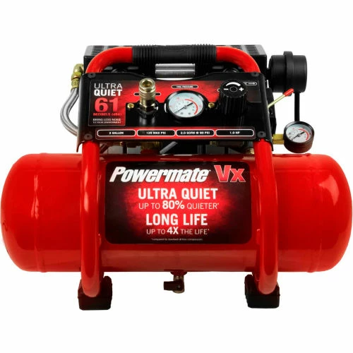 Designed especially for finish and trim work as well as a variety of crafts and hobbies, the Powermate Vx Ultra-Quiet Air Compressor is designed to be one of the quietest air compressors in the industry. At only 61 dB, it is 80% quieter than most standard oil free compressors. Designed to last. This compressor features an efficient dual pump design that operates at significantly slower speeds, which results in less wear and tear on moving parts. All said, this Ultra-Quiet Air Compressor will live up to 4 times longer than that of typical oil-free compressors. And with the oil-free pump and heavy-duty direct drive induction motor, this compressor is maintenance free. The roll cage design creates a convenient and comfortable handle for transportation, storage and protection. With the compact design, it is easy to carry to and from the work site comfortably. The Powermate Vx Ultra-Quiet air compressor is versatile for both professionals and do it your self, especially for projects where quieter operation is needed.
